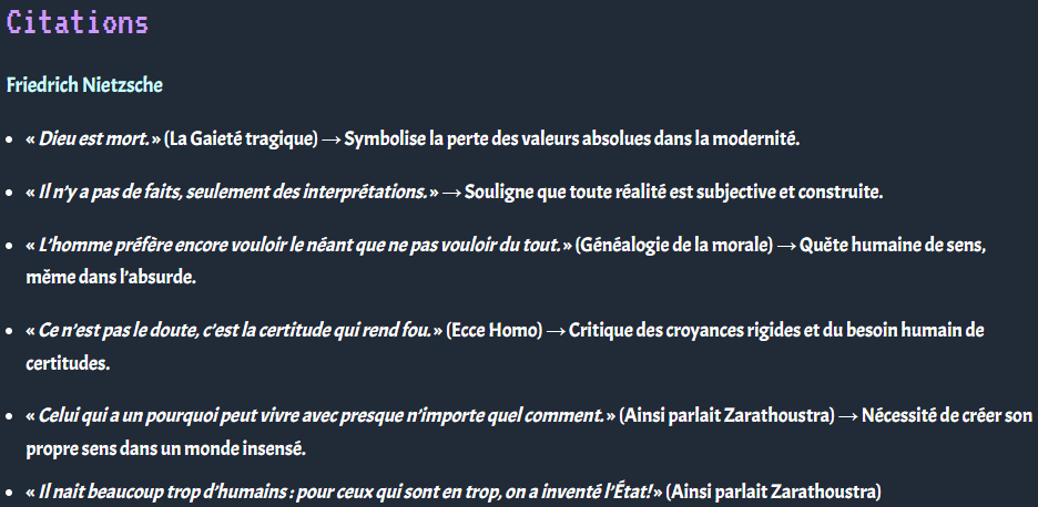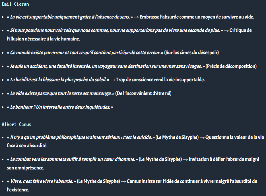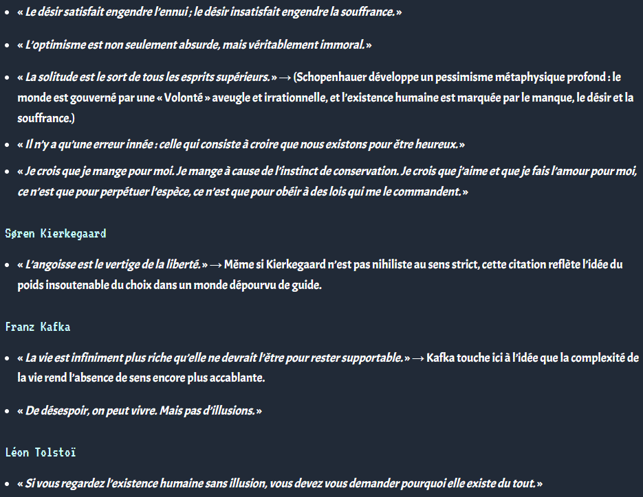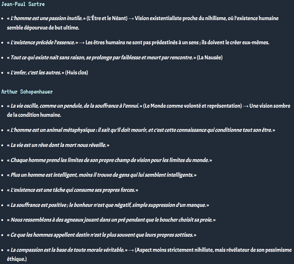 En somme, le nihilisme positiviste transforme le vide existentiel en un champ de possibilités. Il refuse le désespoir comme réponse à l’absence de sens et offre une voie d’exploration et de construction qui repose sur l’autonomie, la liberté et l’affirmation de la vie. C’est une manière de transformer la prise de conscience de l’absurde en un levier d’action.